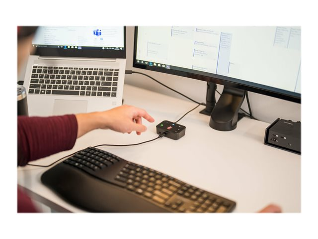 Les professionnels travaillant au bureau, à domicile ou en déplacement ont fréquemment besoin de passer d'une source audio à une autre depuis leur ordinateur portable, leur téléphone ou d'autres appareils. Qu'il s'agisse de répondre à un appel vidéo, de passer un appel téléphonique ou d'écouter de la musique, le basculement entre différents appareils peut être long et complexe. Notre switch audio 3 en 1 permet aux professionnels d'utiliser un même casque filaire ou sans fil tout en basculant entre trois sources audio différentes. Les utilisateurs peuvent facilement basculer entre leur ordinateur portable, leur téléphone ou leur tablette, ce qui leur permet d'augmenter leur productivité. Compatible avec de nombreuses plateformes, telles que Microsoft Teams, Google Meet, Zoom et WebEx, le switch audio 3 en 1 professionnel pour casques offre une expérience audio professionnelle grâce à ses boutons de commande pratiques permettant la commutation des appareils, le contrôle du volume et la désactivation du son.