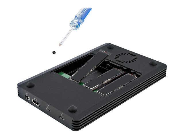 Ce boîtier SSD Thunderbolt 3 à 4x M.2 PCIe vous permet de transformer quatre disques durs solides (SSD) M-Key PCI-Express basés sur M.2 NVMe ou AHCI en une solution de stockage externe haute performance. Le boîtier SSD est auto-alimenté par une alimentation EPS de 72W incluse qui alimente le boîtier, les disques connectés et fournit jusqu'à 15W d'alimentation à tout périphérique Thunderbolt 3 en aval. Un câble hôte certifié Thunderbolt 3 de 70 cm est également inclus, pour connecter le boîtier à votre ordinateur.