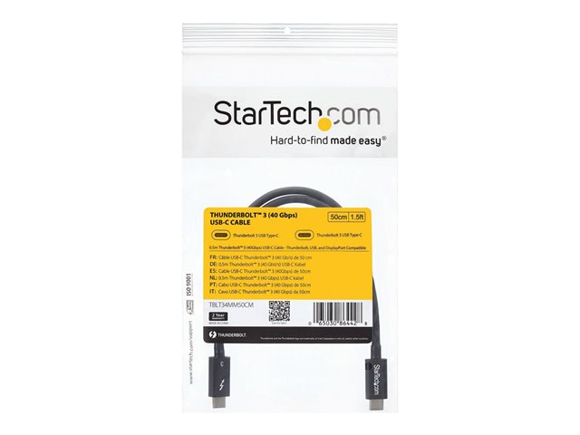 StarTech.com 50cm (1.6ft) Thunderbolt 3 Cable, 40Gbps, 100W PD, 4K/5K Video, Thunderbolt-Certified, Compatible w/ TB4/USB 3.2/DisplayPort - Câble Thunderbolt - 24 pin USB-C (M) pour 24 pin USB-C (M) - Thunderbolt 3 / USB / DisplayPort - 50 cm - noir - pour P/N: PEXUSB321C, TB33A1C, TB3DK2DHV, TB3DK2DHVUE, TB3DK2DPPDUE, TB3DKDPMAW, TB3DKDPMAWUE