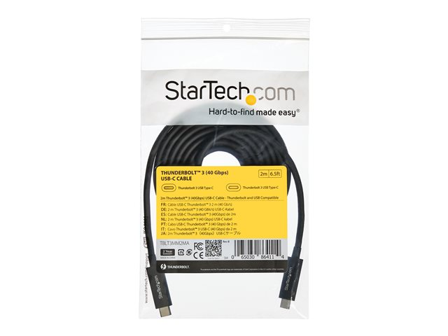 StarTech.com Câble Thunderbolt 3 de 2 m avec Power Delivery 100 W - 40 Gbps (TBLT3MM2MA) - Câble Thunderbolt - 24 pin USB-C (M) pour 24 pin USB-C (M) - Thunderbolt 3 / USB / DisplayPort - 2 m - support 4K - noir - pour P/N: CDP2HDUACP, CDP2HDUACPW, TB33A1C, TBDOCKHDPBC