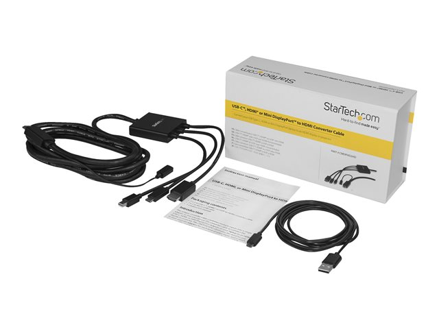 StarTech.com Câble adaptateur USB-C, HDMI ou Mini DisplayPort vers HDMI de 2 m - Convertisseur 3-en-1 USB Type-C HDMI Mini DP vers HDMI - Câble adaptateur - HDMI, Mini DisplayPort, 24 pin USB-C mâle pour HDMI, Micro-USB de type B (alimentation uniquement) - 2 m - noir - support 4K, alimentation USB, passif