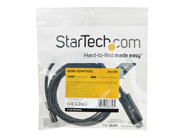 StarTech.com 6ft (2m) HDMI to Mini DisplayPort Cable 4K 30Hz, Active HDMI to mDP Adapter Converter Cable with Audio, USB Powered, Mac & Windows, HDMI Male to mDP Male Video Adapter Cable - HDMI to mDP Converter (HD2MDPMM2M) - Câble vidéo/audio - HDMI, USB (alimentation uniquement) mâle pour Mini DisplayPort mâle - 2 m - noir - support 4K