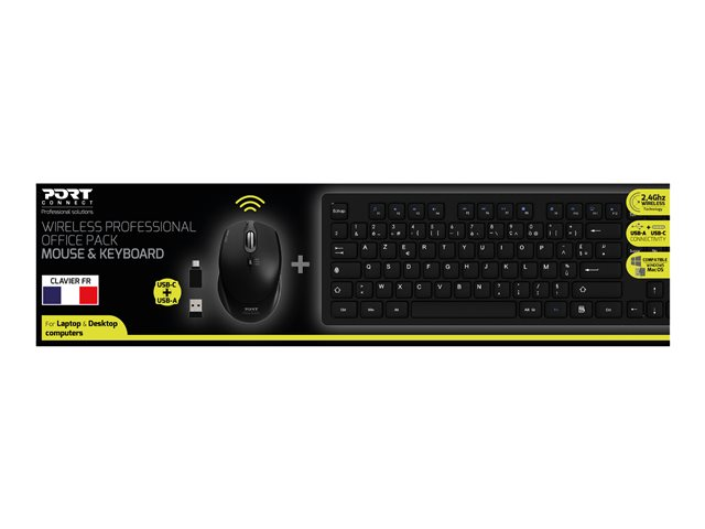 Le pack de bureau professionnel sans fil PORT Connect comprend une souris et un clavier. Sa technologie sans fil 2,4 Ghz offre une liberté de movement jusqu'à 20 mètres. Compatible avec Windows et Mac OS, sa double connectivité USB-A et USB-C la rend universelle. Aucun pilote n'est nécessaire grâce à son installation Plug & Play. La souris sans fil incluse offre un confort d'utilisation optimal grâce à son design ergonomique, ambidextre et léger. de plus, sa vitesse réglable de 800/1200/1600 DPI offre une grande précision. Le clavier inclus est conçu de manière durable et antidérapante avec des lignes rondes et lisses parfaitement adapté pour un environnement de travail. Ses 12 touches de raccourcis multimédia et son pavé numérique intégré permettent une polyvalence accrue.