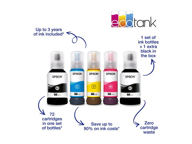 Économisez jusqu'à 90 % sur vos coûts d'impression avec les imprimantes et multifonctions EcoTank sans cartouche d'Epson. Fourni avec des bouteilles d'encre haute capacité, ses réservoirs d'encre intégrés sont faciles à remplir grâce aux bouteilles d'encre spécialement conçues. Sans aucune cartouche à remplacer et doté de fonctionnalités de connectivité flexibles, d'un fax et d'un chargeur automatique de documents, ce multifonction est idéal pour les personnes qui recherchent des impressions de haute qualité et un coût par page incroyablement bas.