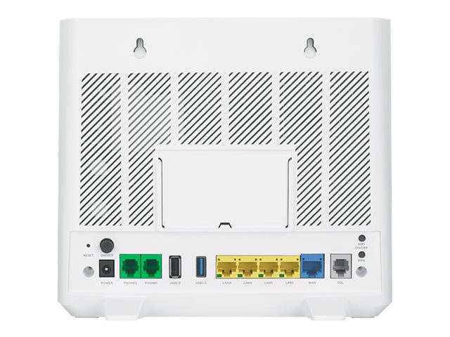 | Interfaces | LAN: 4 x 10Base-T/100Base-TX/1000Base-T - RJ-45 WAN: 1 x 10Base-T/100Base-TX/1000Base-T - RJ-45 1 x DSL - RJ-11 USB 2.0: 1 x USB de type A 4 broches USB 3.0: 1 x USB 9 broches type A Ligne téléphonique: 2 x FXS - RJ-11 |