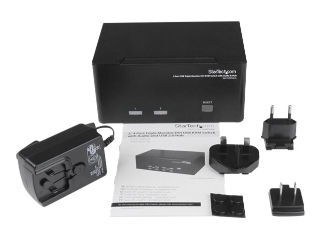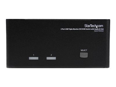 Le commutateur KVM USB DVI trois écrans 2 ports SV231TDVIUA permet à 2 ordinateurs (comprenant chacun 3 sorties vidéo DVI) de partager des écrans, 1 microphone et 1 jeu de haut-parleurs, 1 clavier et 1 souris, ainsi qu'un périphérique USB 2.0 supplémentaire, comme un disque dur, une clé USB, une imprimante ou une webcam.